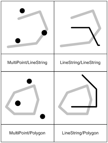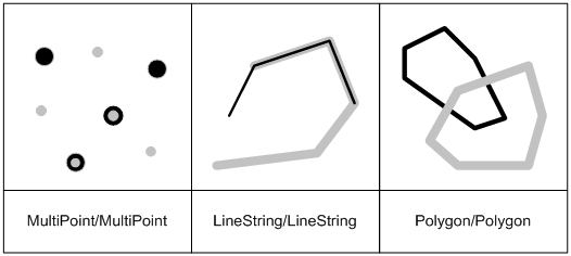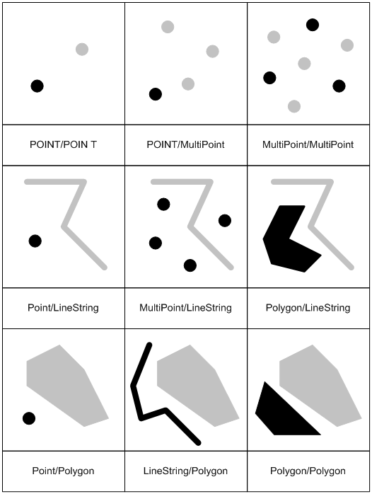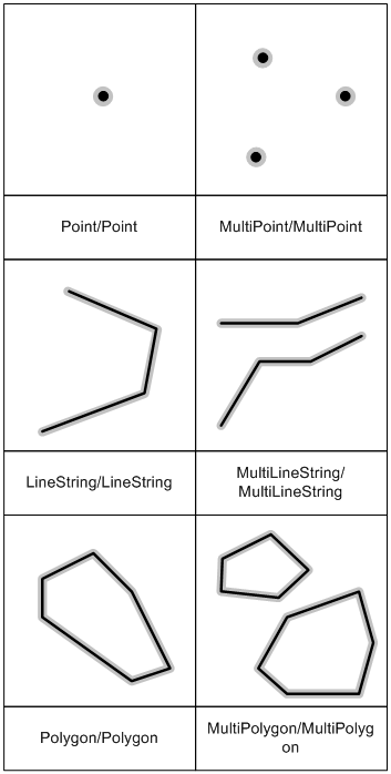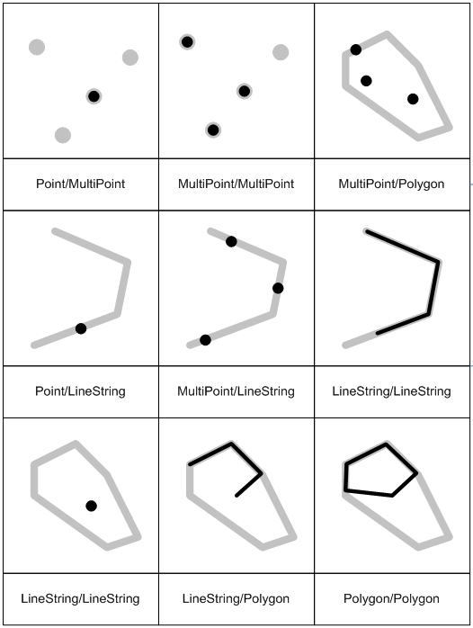 | GEOMETRYCOLLECTION | Two or more non-GEOMETRYCOLLECTION type spatial objects | Maximum of 2 diemensions | * | * | The interior of all spatial objects | The boundaries of all spatial objects | Surface |