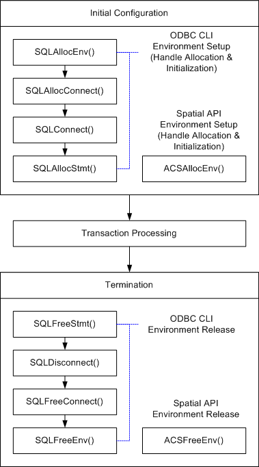 In this stage, environment settings are made, and connection handles are allocated and initialized. The handles that must be allocated during the initial configuration include those that are needed to call the Spatial API. The order in which the Spatial API or the ODBC API is initialized is irrelevant.
