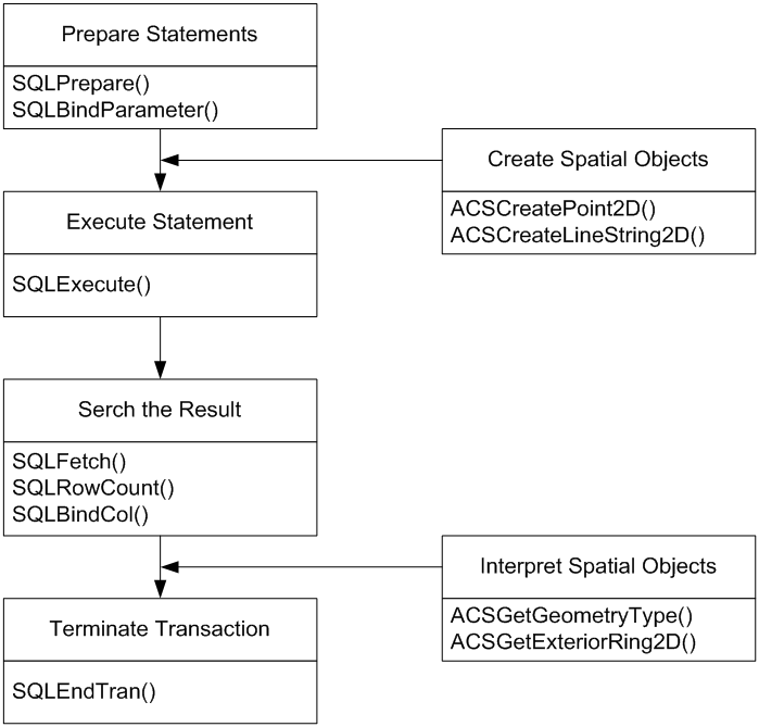 in the following diagram. Between ODBC calls, spatial object creation and search functions are called in order to manipulate spatial objects.