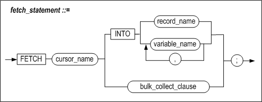 The FETCH statement is used to retrieve one record at a time from the set of results that satisfy the cursor’s SELECT statement and store it in one or more variables. Each column can be stored in a separate variable, or the entire row can be stored in a RECORD type variable, typically declared using %ROWTYPE, having the same number and type of fields as the retrieved record.