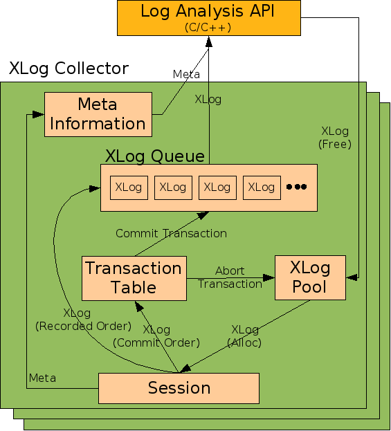 The XLog Collector consists of meta data, an XLog queue, a transaction table and an XLog pool. It is called via the Log Analysis API.