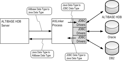 아래 그림은 지역 서버인 Altibase와 AltiLniker 사이의 데이터 타입 변환과 AltiLinker와 각 이기종 데이터베이스의 JDBC 드라이버간의 데이터 타입 변환이 어떻게 이루어지는지를 보여준다.