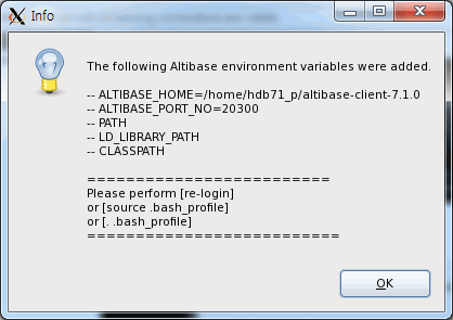 이 과정 동안 왼쪽의 다이얼로그 박스에서 보여주는 Altibase 클라이언트 제품과 관련 있는 환경 변수는 로그인 쉘 (예를 들어, 표준 본 쉘을 위한 기본 환경 파일은 .profile이다)을 위한 환경 파일에 추가된다.