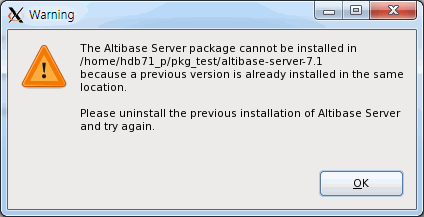 사용자가 입력한 디렉터리에 Altibase 제품이 이미 설치되어 있다면, 경고 메시지가 다이얼로그 박스에 보여진다. 이 경우 다른 디렉터리를 선택하든지, 그 디렉터리에 설치된 제품을 먼저 언인스톨 해야한다.
