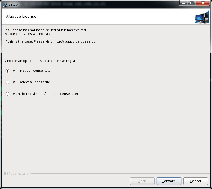 라이선스 추후 등록: 라이선스 키를 아직까지 얻지 못했다면, 나중에 라이선스 키를 획득한 후, $ALTIBASE_HOME/conf 디렉터리에 새 라이선스 파일을 복사하면 된다.