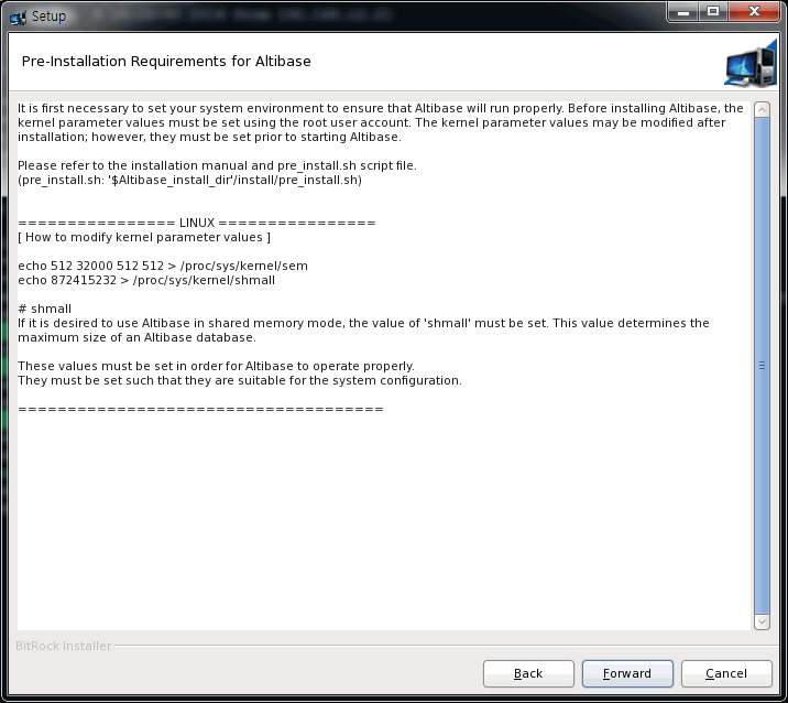 커널 파라미터 설정은 다음 설치 단계로 넘어가기 전에 수동으로 하길 권한다. 만약 설치 완료 후에 설정하려면, $ALTIBASE_HOME/install/pre_install.sh 파일을 참고하기 바란다.
