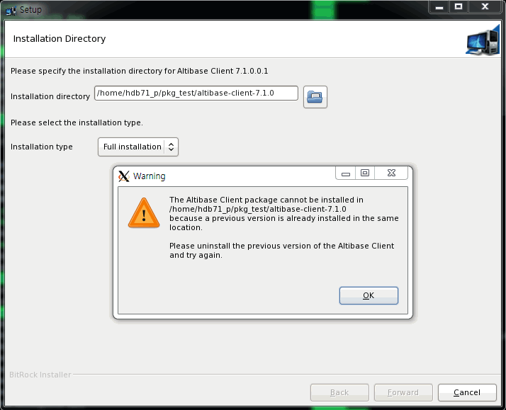 패치를 적용하기 전에 베이스 릴리스가 설치되어 있어야 한다. Altibase 제품이 사용자가 지정한 디렉터리에 설치되어 있지 않다면, 경고 메시지를 보여주는 다이얼로그 박스가 나타난다.