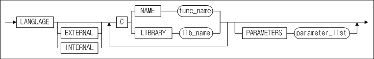 사용자 함수 이름과 라이브러리 객체의 이름, 파라미터들을 지정하고, internal mode 또는 external mode를 설정 할 수 있다. 만약 EXTERNAL, INTERNAL을 명시하지 않으면, EXTERNAL 모드로 동작한다.
