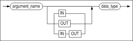 인자는 생략할 수 있으며, 인자를 명시할 경우엔 인자의 명칭, 데이터 타입 및 입출력 구분을 명시해야 한다. 사용 가능한 입출력 유형은 다음 세가지 중의 하나이고 생략 시에 IN이 기본값이 된다.