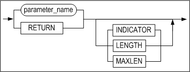 외부 함수의 반환값을 가져오는 파라미터임을 명시하는 키워드이다. RETURN 뒤에 함수 파라미터와 마찬가지로 속성 파라미터를 추가로 명시할 수 있다. 속성 파라미터에 대해서는 CREATE PROCEDURE 구문의 설명을 참고하기 바란다.