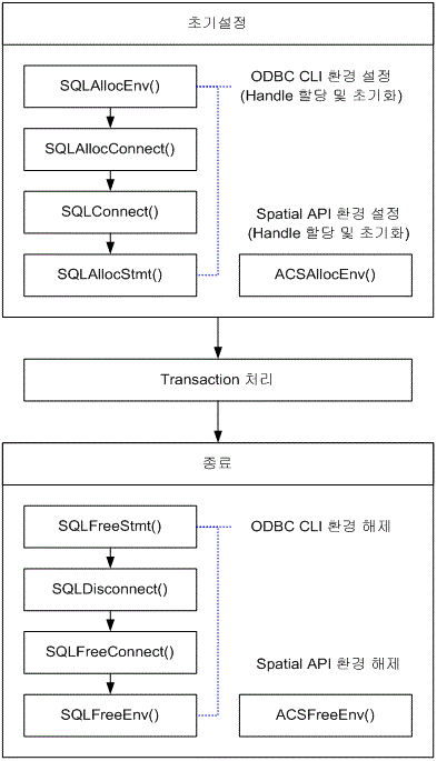 ODBC CLI 애플리케이션 프로그램은 아래 그림과 같이 전형적으로 크게 3단계로 구성되며 그 단계의 중간에 Spatial API가 같이 호출되게 된다.
