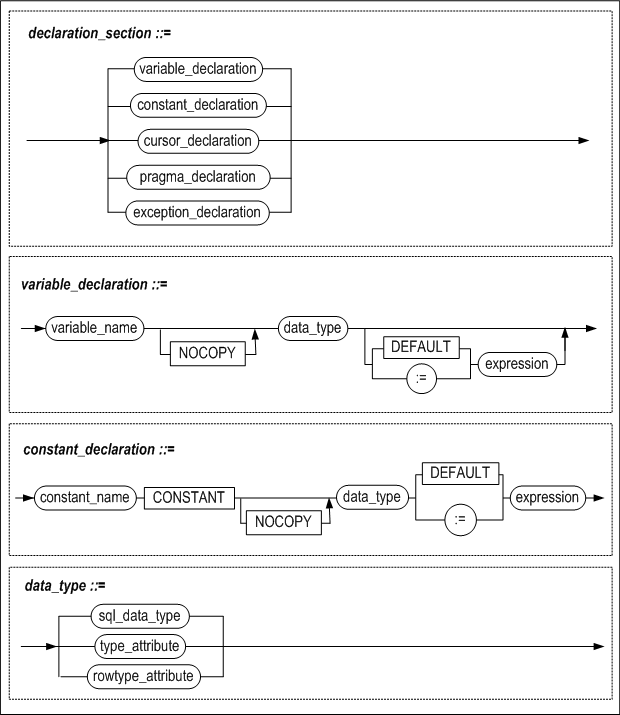 선언부는 메인 블록에서는 AS와 BEGIN 키워드 사이에 위치하며, 하위 블록에서는 DECLARE와 BEGIN 키워드 사이에 위치한다. 해당 블록 내에서 사용하는 지역 변수, 커서와 사용자 정의 예외 등을 선언한다.