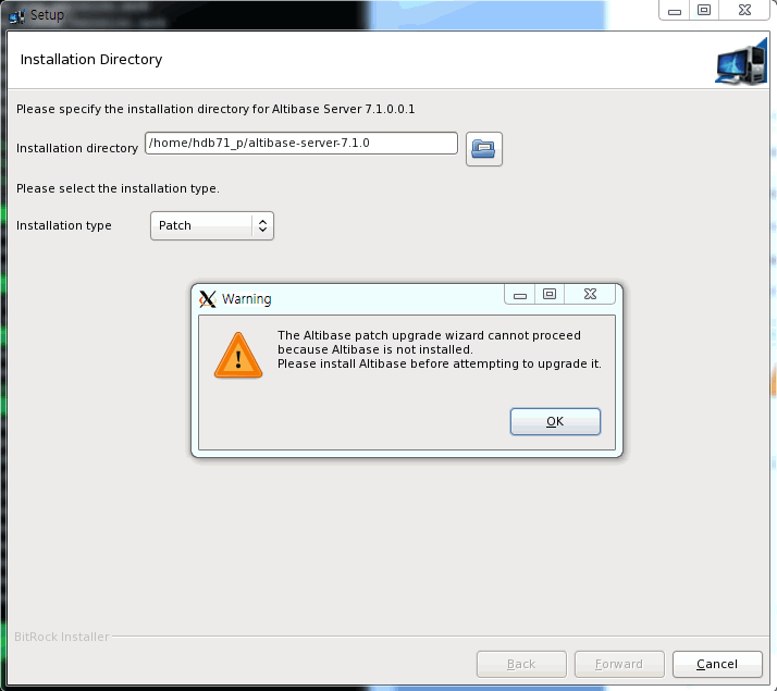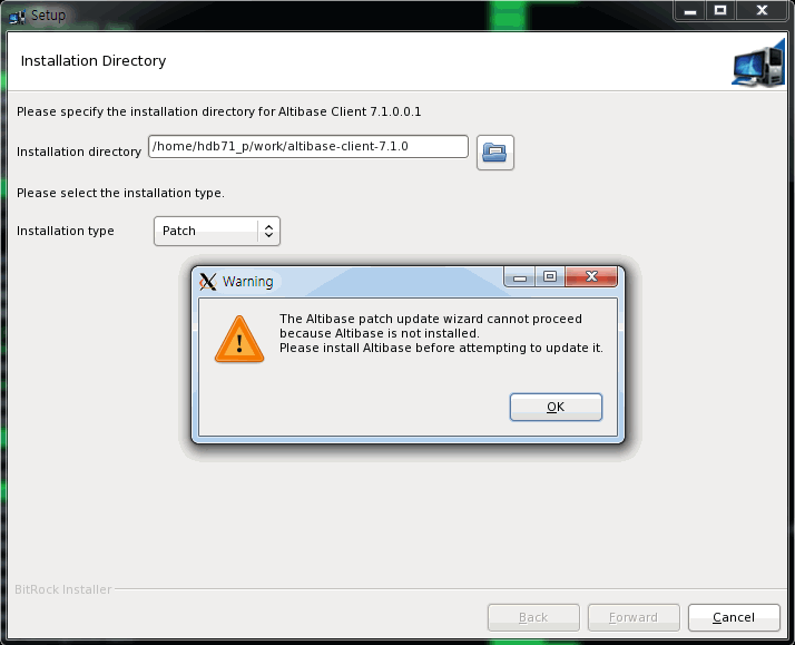 패치를 적용하기 전에 베이스 릴리스가 설치되어 있어야 한다. Altibase 제품이 사용자가 지정한 디렉터리에 설치되어 있지 않다면, 경고 메시지를 보여주는 다이얼로그 박스가 나타난다.