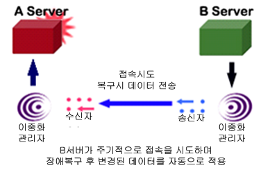 주라인이 단절되어있는 동안에도 이중화 작업을 통해 서버 B에서 작업한 내용을 서버 A에 전송한다.