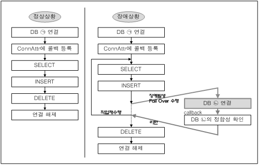 Fail-Over 수행시에 데이터베이스의 정합성 확인을 위해 콜백 함수를 작성해야 한다. 응용 프로그램 형태별로 Fail-Over 콜백 작성 방법이 다르지만 기본 구조는 유사하며 다음과 같은 구조를 가진다.