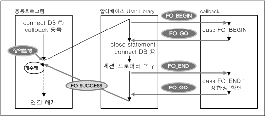 이 사용자 라이브러리는 등록된 Fail-Over 콜백에게 Fail-Over 시작 이벤트(FO_BEGIN)를 보낸다. Fail-Over 콜백에서는 Fail-Over를 계속 진행할지 여부를 반환(return)한다.