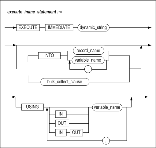 EXECUTE IMMEDIATE dynamic_string 구문은 해당 질의문을 Direct-Execute 방식으로 실행한다. USING 뒤에 나오는 변수는 바인드할 인자이다. DDL 및 DCL의 경우도 DML과 마찬가지로 EXECUTE IMMEDIATE를 사용하여 실행할 수 있다.