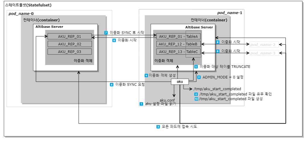 ⚠️ 모든 파드에서 실행하는 aku 실행 파일은 같은 버전을 사용해야 하며, aku 설정 파일 내 프로퍼티도 같은 값을 가져야 한다. 일반적으로 aku 실행 파일과 aku 설정 파일은 Altibase 컨테이너 이미지에 포함되어 있다.