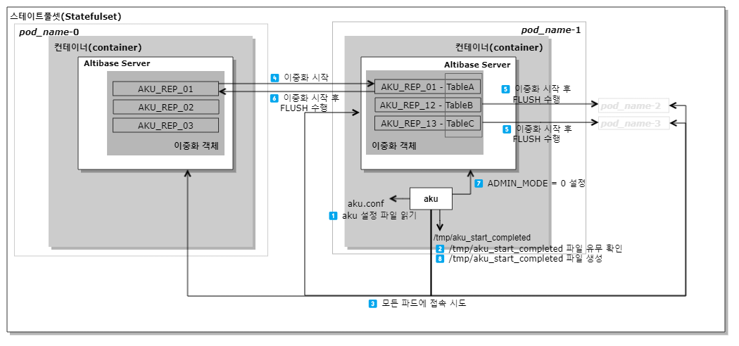 ⚠️ 모든 파드에서 실행하는 aku 실행 파일은 같은 버전을 사용해야 하며, aku 설정 파일 내 프로퍼티도 같은 값을 가져야 한다. 일반적으로 aku 실행 파일과 aku 설정 파일은 Altibase 컨테이너 이미지에 포함되어 있다.